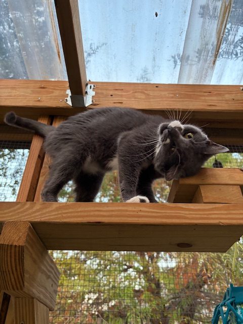 A 1,500 sf enclosure that houses the feral and semi-feral cats at the Sanctuary. Designed and constructed by volunteers and donations. This enclosure has a heated and air-conditioned feeding station and shelter for inclement weather conditions. It also has two individual “suites” for acclimation periods and housing for cats that are sensitive to outdoor conditions, and require conditioned space for health reasons.