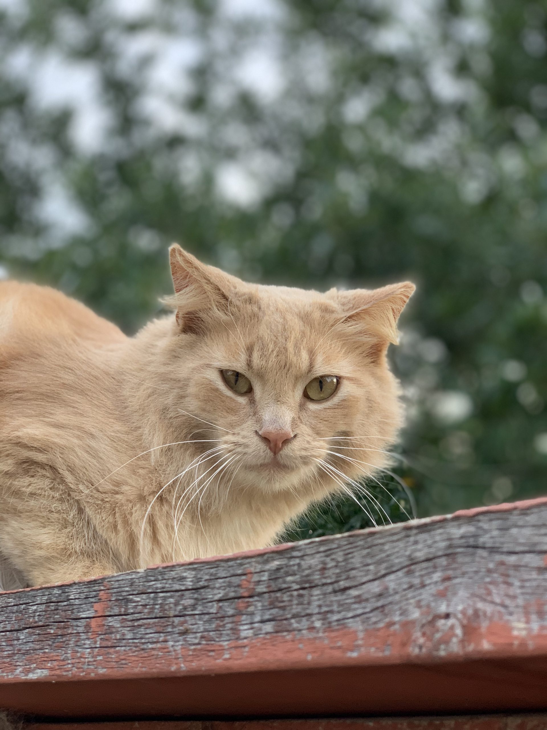 Miss Iris came to the Sanctuary after her feeder passed away and the family sold the property. Iris was an intact female that was very difficult to trap. When Iris was taken to the vet for spaying and vaccinations, we discovered that she had pyometra. Pyometra is a life-threatening bacterial infection of the uterus. When left untreated (by spaying) it is fatal. By trapping and vetting Iris, it quite literally saved her life. Iris has settled into the Sanctuary life and has become a very sweet cat that loves affection and we are happy to have her here. She was named Iris after the woman that took her in, gave her shelter, and fed her.